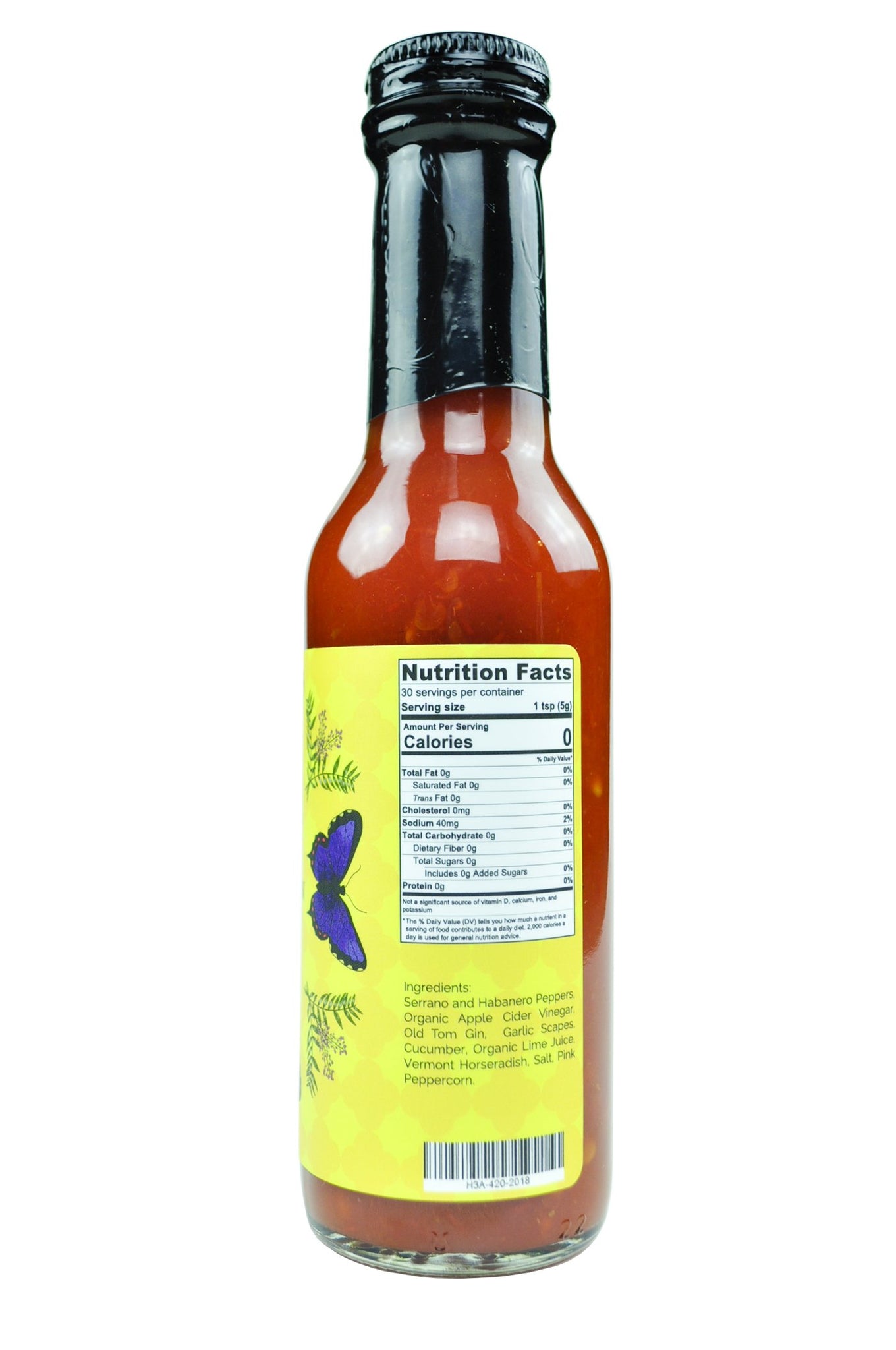 Ingredients: Serrano and habanero peppers, organic apple cider vinegar, Old Tom gin, garlic scapes, cucumber, organic lime juice, Vermont horseradish, salt, pink peppercorn