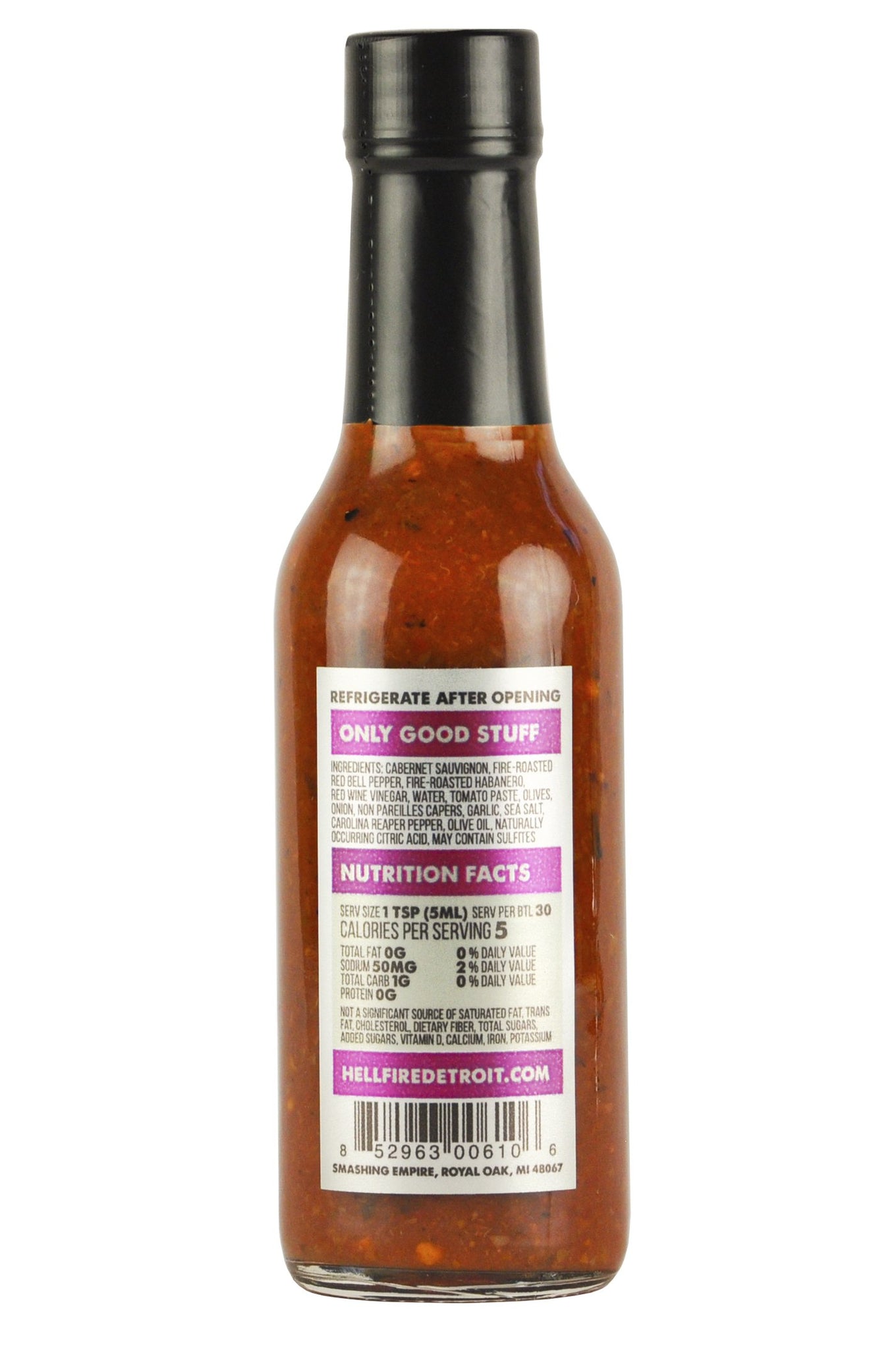 Ingredients: Cabernet sauvignon (may contain sulfites), fire-roasted red bell pepper, fire-roasted habanero, red wine vinegar, water, tomato paste, olives, onion, non-pareilles capers, garlic, sea salt, carolina reaper pepper, olive oil, naturally occurring citric acid