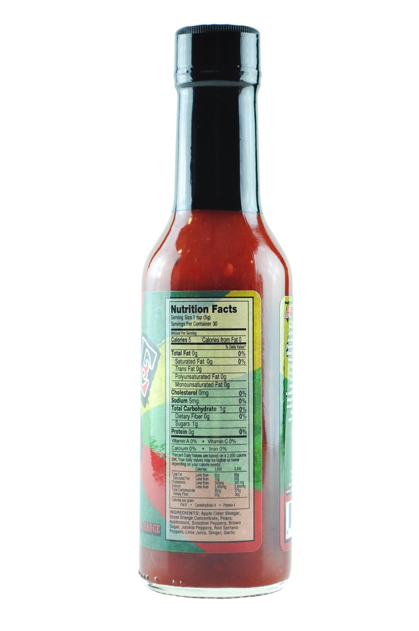 Ingredients: Apple cider vinegar, blood orange concentrate, pears, applesauce, scorpion peppers, brown sugar, jolokia peppers, red serrano peppers, lime juice, ginger, garlic