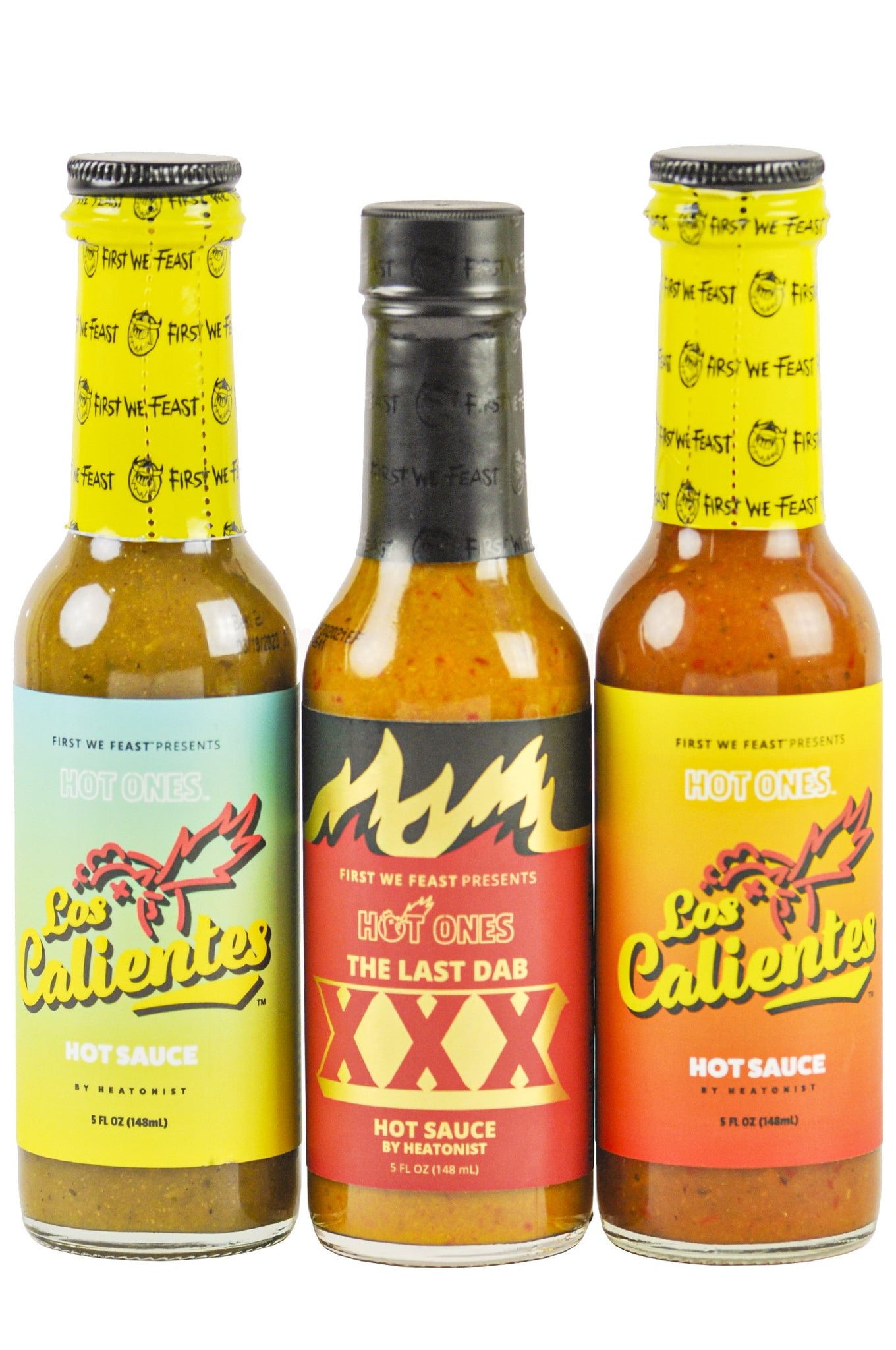 Double the Los Calientes, double the flavor! This new combination of the Hot Ones Trio includes three fan favorite sauces from the lineup: Los Calientes, Los Calientes Rojo and The Last Dab XXX. Starting at 4/10 in heat, Los Calientes is not your average verde thanks to tangy tomatillos, smoky cumin, sparky habanero and a kiss of sweetness from apricots. Los Calientes Rojo is a sweeter, hotter version with applewood smoked red jalapeños, an extra handful of habaneros and a splash of citrus. Originally intended to be a limited edition, we had to make it part of the lineup for its crowd-pleasing flavor and 5/10 heat. Last but certainly not least, The Last Dab XXX needs no introduction. The heavyweight of the Hot Ones lineup, The Last Dab XXX features three different strains of Smokin’ Ed’s Pepper X, the hottest pepper in the world. The perfect pack for the ultimate spice lord!