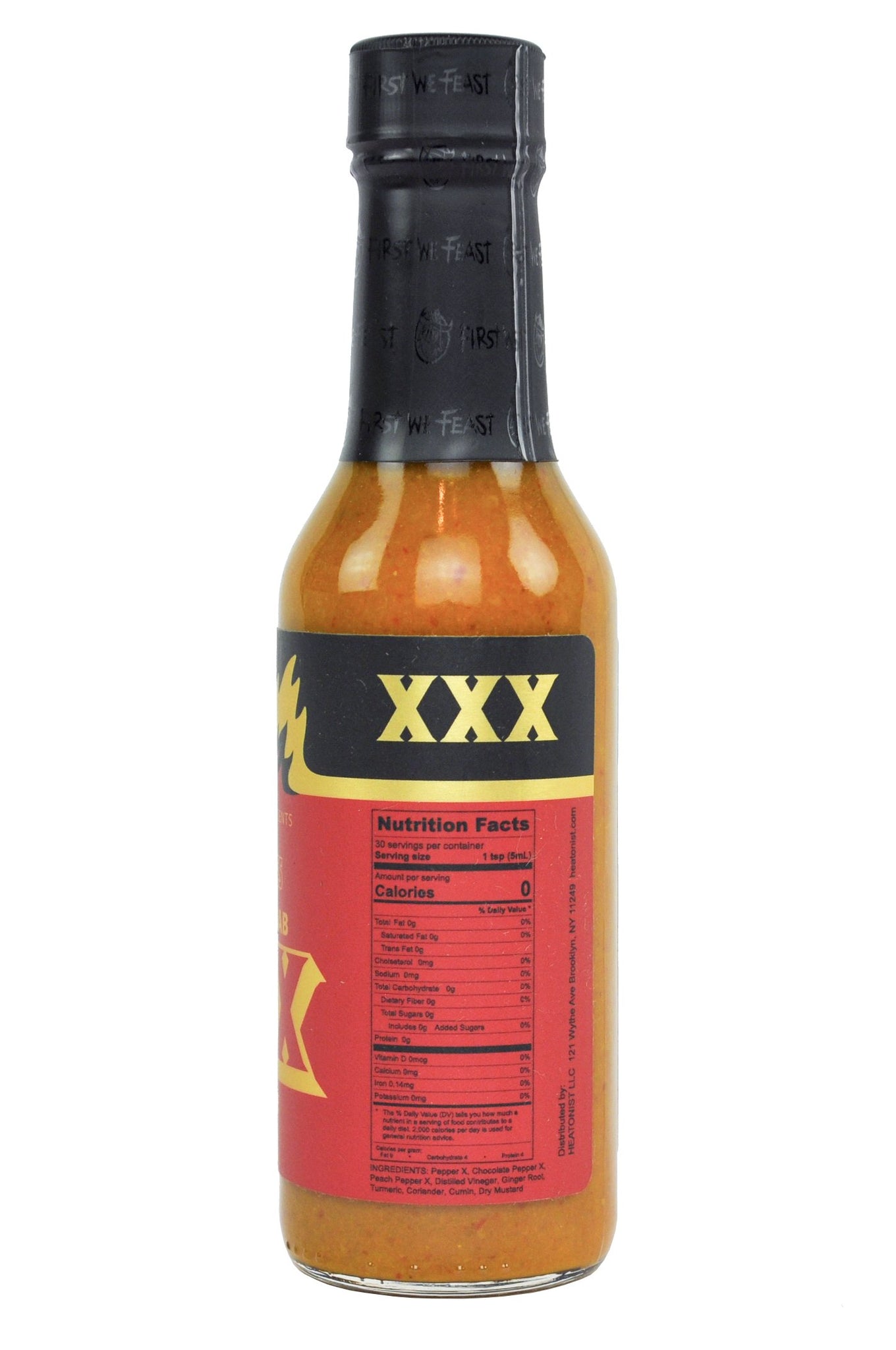 Ingredients: Pepper X, chocolate pepper X, peach pepper X, distilled vinegar, ginger root, turmeric, coriander, cumin, dry mustard