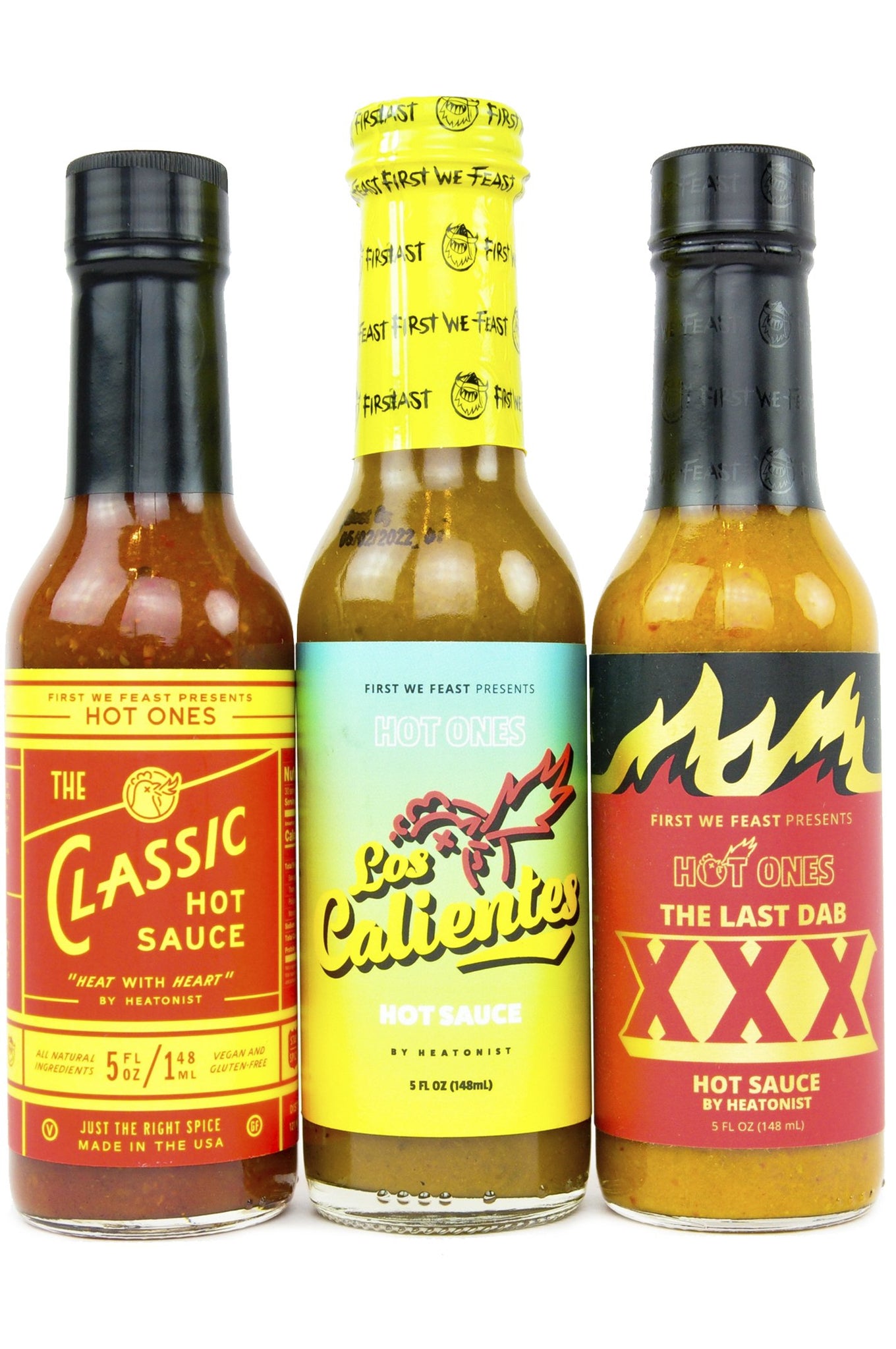 The ultimate Hot Ones pack! Featuring our three signature Hot Ones sauces, this Trio takes you on a journey from mild to XXX wild with the first, fourth and tenth sauces in the lineup. Kicking things off with is The Classic - an ode to traditional American sauce legacies. Then Los Calientes shakes things up with smokey-sweet, baja Cali vibes. Last but certainly not least, The Last Dab XXX is the latest in a long legacy of ferocious final sauces, this time with three different variants of Pepper X. Dab up some wings for a mini Hot Ones challenge or pair with the Heat and Warm Up Packs for the full experience.