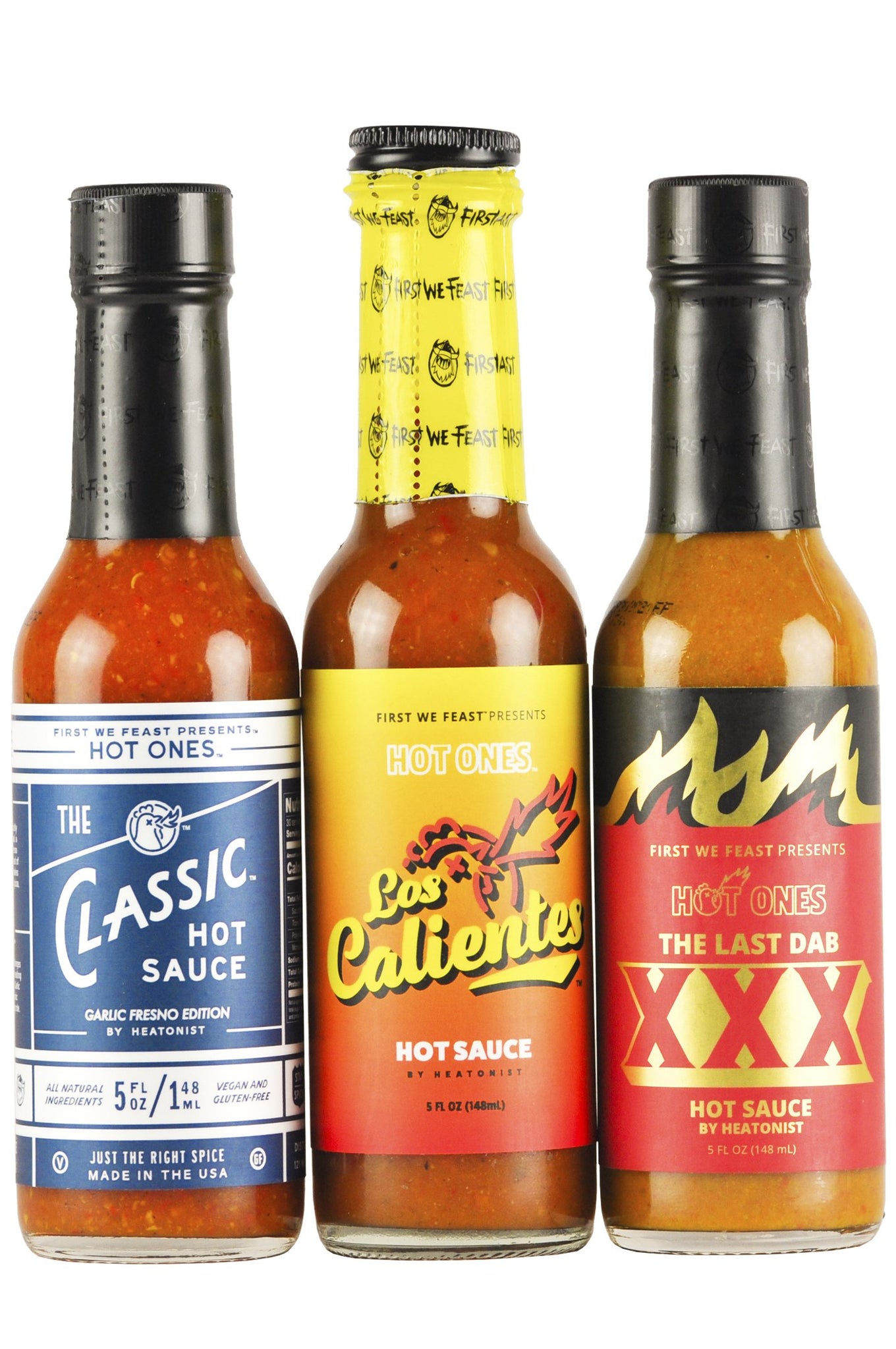 The official Trio of Hot Ones Season 12! This pack features the first, fifth and tenth sauces in the lineup, including our newest Hot Ones exclusive, The Classic: Garlic Fresno Edition or "Blue Label." Born from a delicious accident, this edition maxes out the garlic and swaps in beautiful Fresno chiles from Smokin’ Ed’s farm. In the five spot is Los Calientes Rojo, a fruity sauce that mixes habanero heat and cumin smoke with the sweetness of apricots and a splash of citrus. At this point, The Last Dab XXX needs no introduction. But just in case you forgot, its three different varieties of Smokin’ Ed’s Pepper X form the flaming finish to the lineup, leaving celebrities teary eyed and gasping for the green room. No Hot Ones challenge is complete without this trio of all-stars!