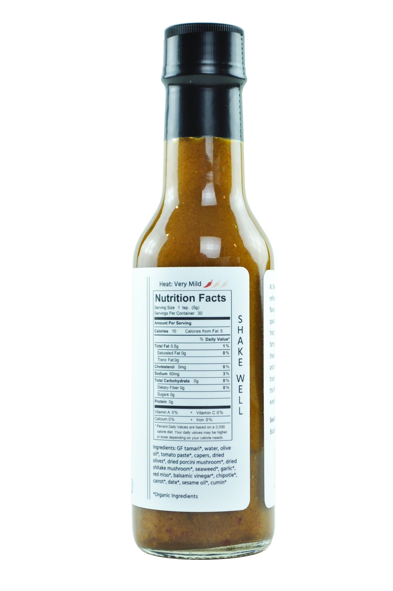 Ingredients: Soy sauce, water, olive oil, tomato paste, capers, dried olives, dried porcini mushroom, dried shiitake mushroom, seaweed, garlic, red miso, balsamic vinegar, chipotle, carrot, date, sesame oil, cumin