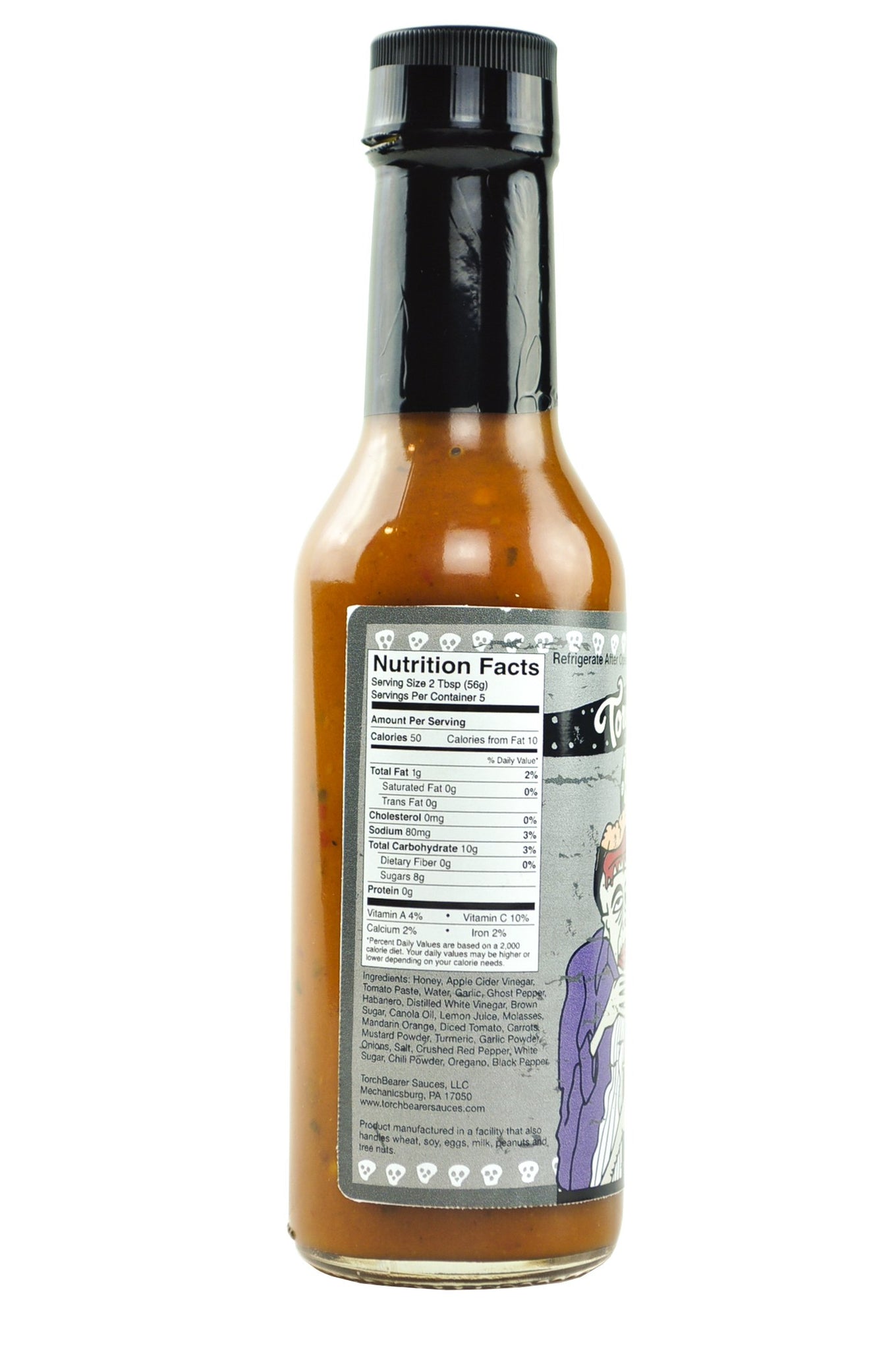 Ingredients: Honey, apple cider vinegar, tomato paste, water, garlic, ghost pepper, habanero, distilled white vinegar, brown sugar, canola oil, lemon juice, molasses, mandarin orange, diced tomato, carrots, mustard powder, turmeric, garlic powder, onions, salt, crushed red pepper, white sugar, chili powder, oregano, black pepper