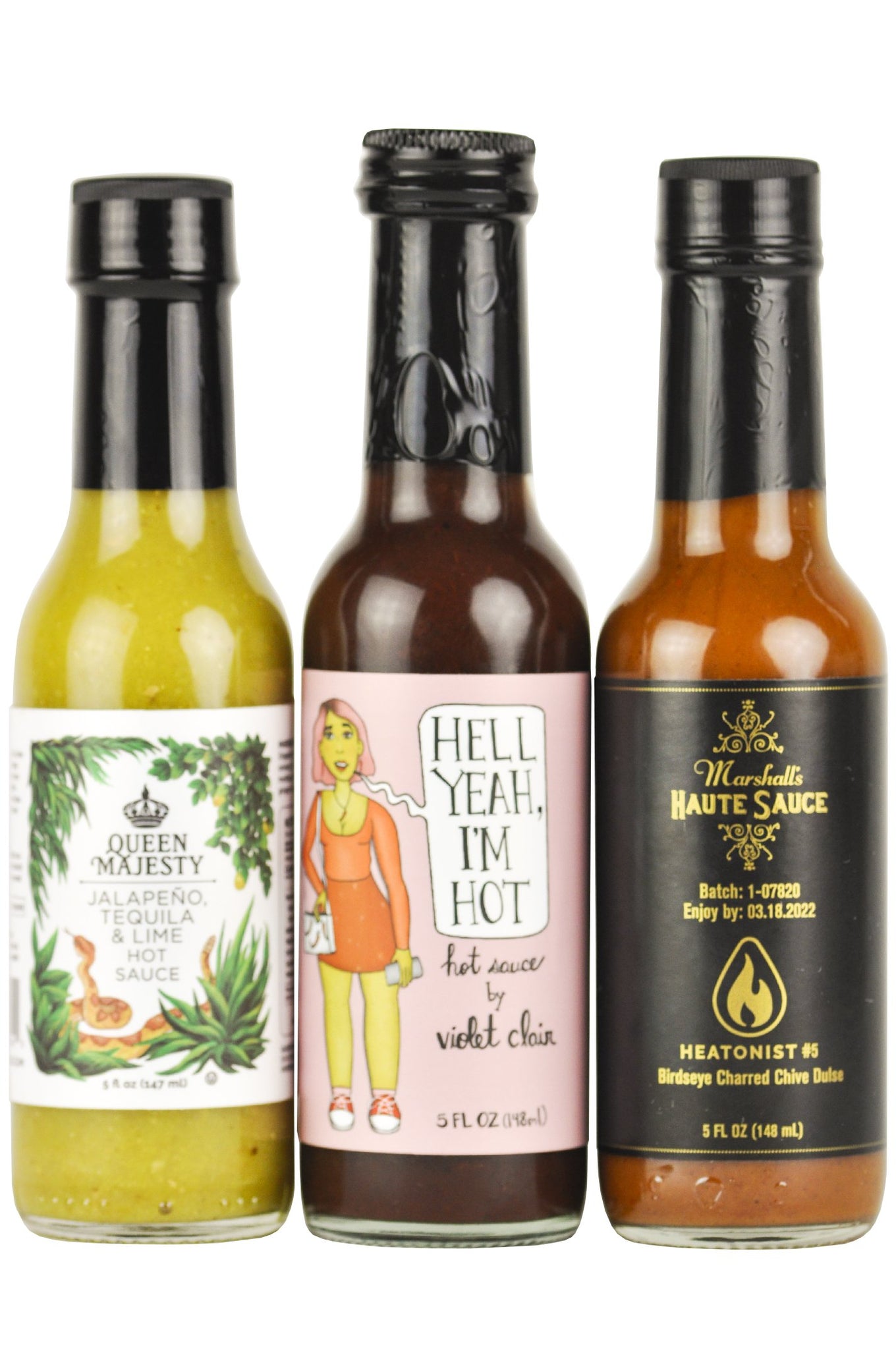 This set features sauces from some of the best women makers who are crafting all-natural, nuanced and downright delicious hot sauces! Claire Georges founded her business, Butterfly Bakery of Vermont, with baked goods in mind, but visitors quickly raved about her hot sauces featuring fresh local produce and Vermont maple syrup. Sarah Marshall of Marshall’s Haute Sauce wrote the book on canning, translating her love of preserving into a line of unique sauces. She was the perfect partner to collab with on our latest anniversary sauce. Rounding out this amazing trio is Erica Diehl of Queen Majesty, a bit of a legend around Brooklyn where she makes rave-worthy sauces, designs her own bottle labels and has been known to slay a DJ set.